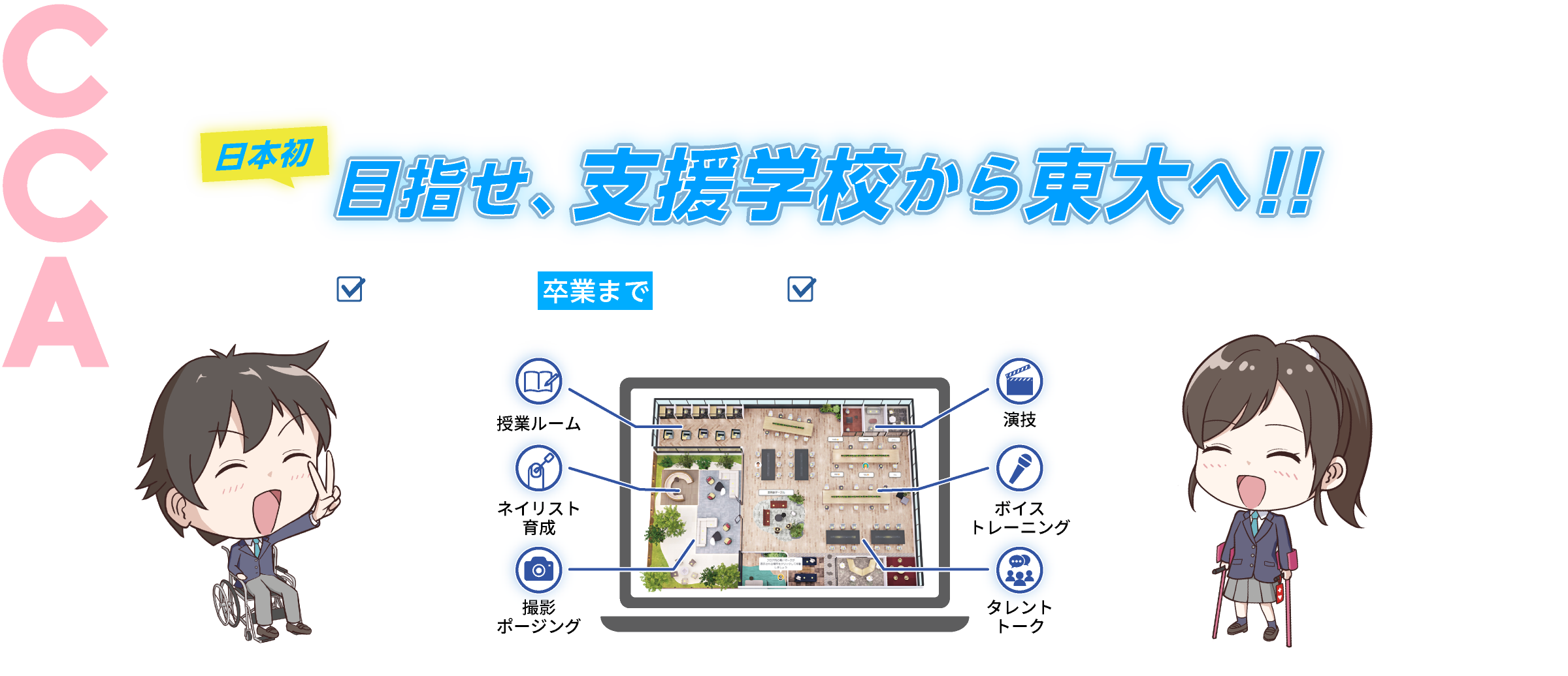 CCA(チャレンジド・チャレンジ アカデミー)は、特別支援学校 在学生・卒業生の大学入学から卒業までをサポートする日本初のサポート塾です。